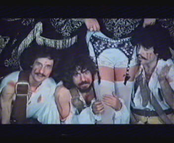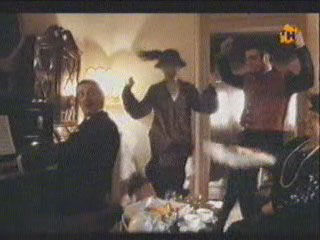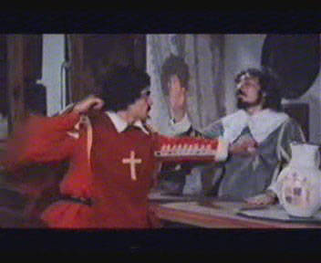 Y en la tarea de recuperar el liguero entran en juego los mosqueteros, que como broma recurrente a lo largo de la película, se preguntarán dónde está D’Artagnán cuando se le necesita, mientras todo el mundo pregunta “¿Los Tres Mosqueteros? ¿Pero no eran cuatro?” Seremos testigos del inicio musical del lema “uno para todos y todos para uno”, que en la novela no se cita más que una vez, y tampoco en plan heróico (pinche AQUÍ si quiere deleitarse con tan imprescindible momento musical: http://www.youtube.com/watch?v=Yg22kJVejHs); también veremos cosas estupendas como a los tres mosqueteros llegar a Londres en lancha zodiac o montar en moto (una de ellas, cagando por el tubo de escape; luego diremos que el humor de American Pie es descerebrado), a Richelieu cagándose vivo por un atracón de ciruelas, y un par de números musicales que no vienen muy a cuento, con imitaciones de Los Tres Sudamericanos cantando “Gibraltareña”, y Rafaella Carrá con una versión rara de “Qué dolor”, esta última aderezada por la intrusión de un mando a distancia que hace a los mosqueteros acelerar, ir hacia atrás y quedarse en pausa. Hasta los Monty Python habrían llamado al orden a los guionistas.